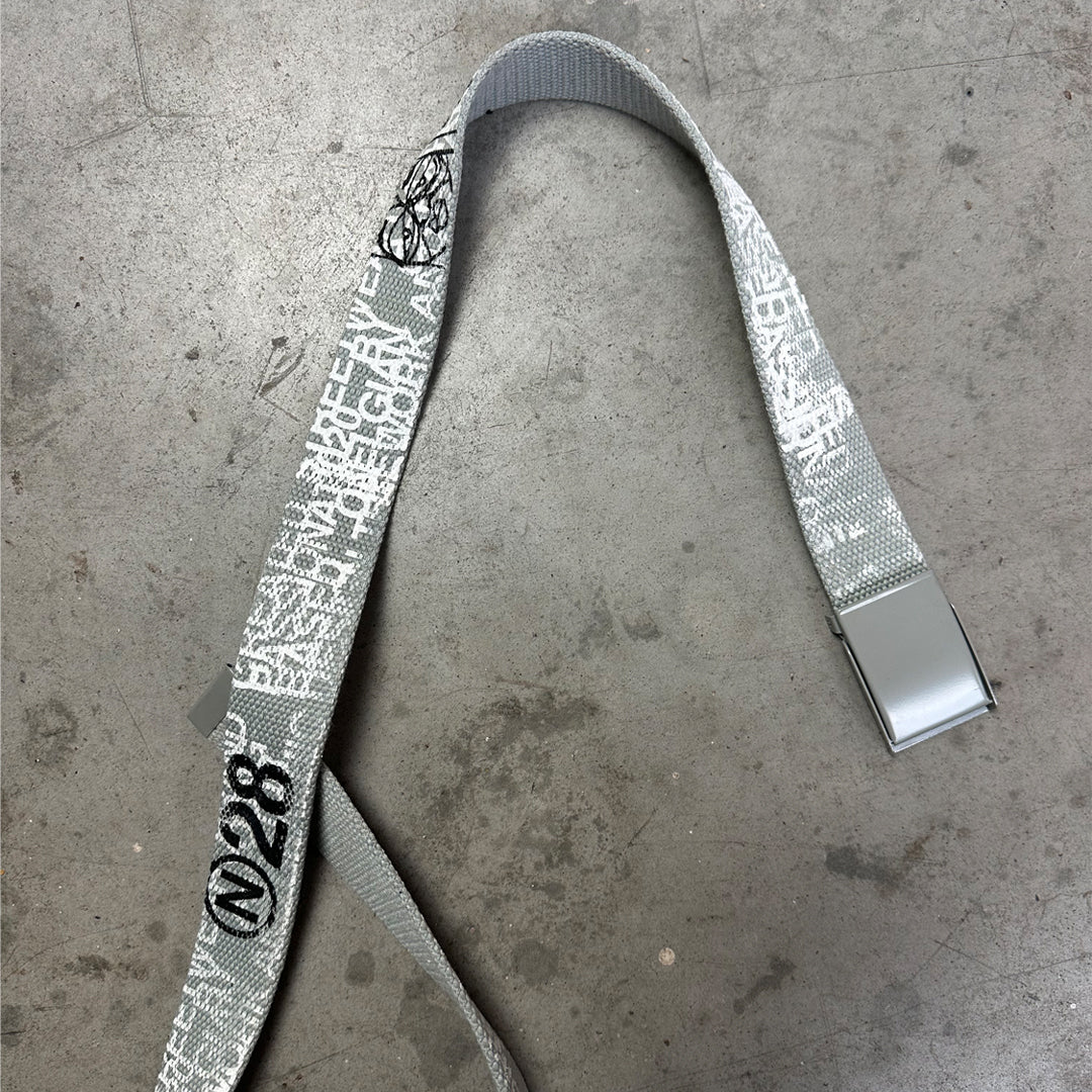 Ceinture grise claire avec plusieurs sérigraphies blanche et noire superposées.