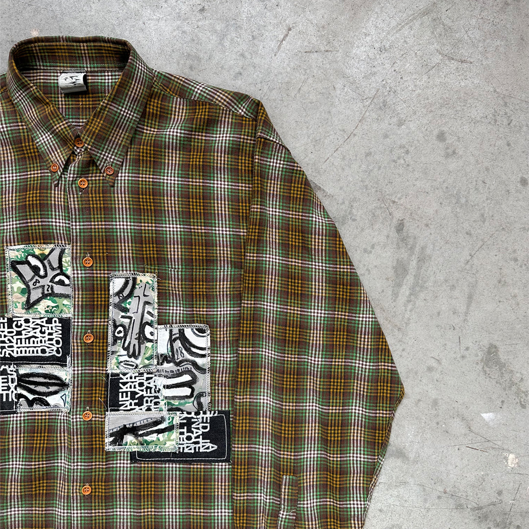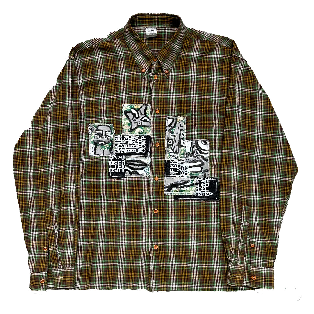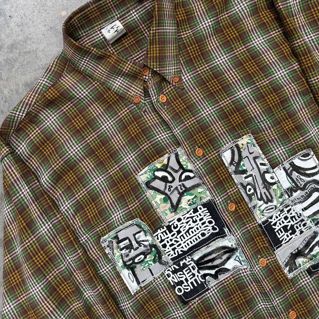 Chemise avec des patchs peint et sérigraphié cousus, créé en collaboration avec l'artiste Jaejay.