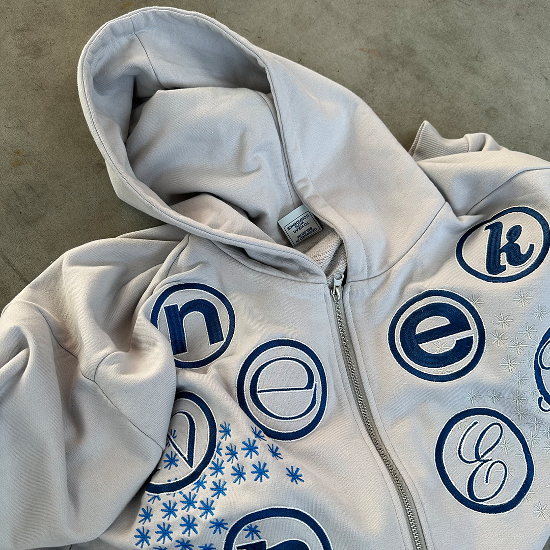 GREY ZIP FULL EMBROIDERY OF DIFFERENTS LETTER AND TYPOGRAPHY