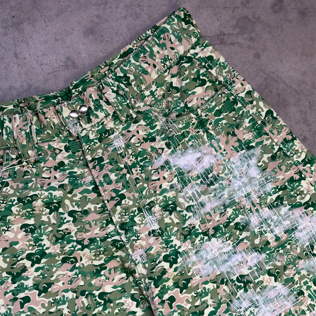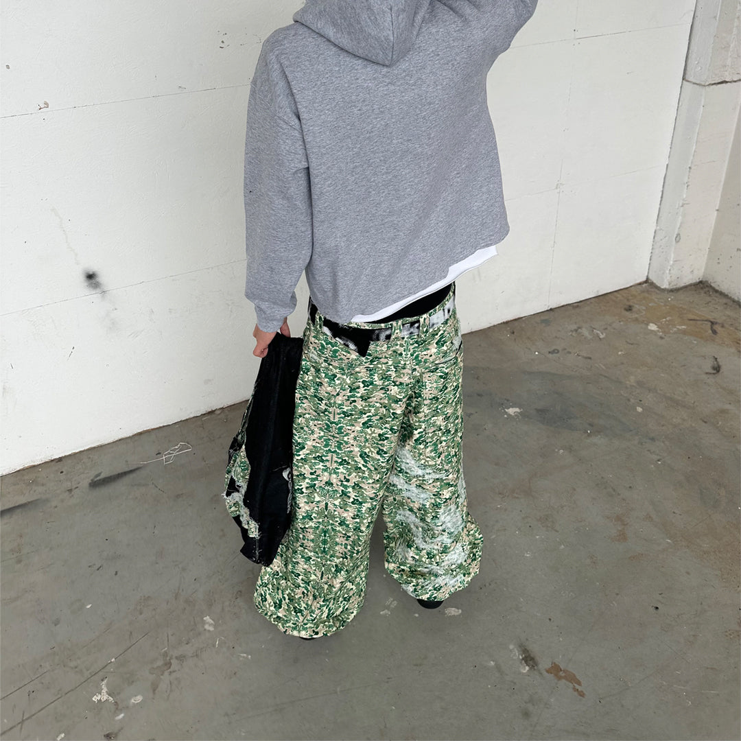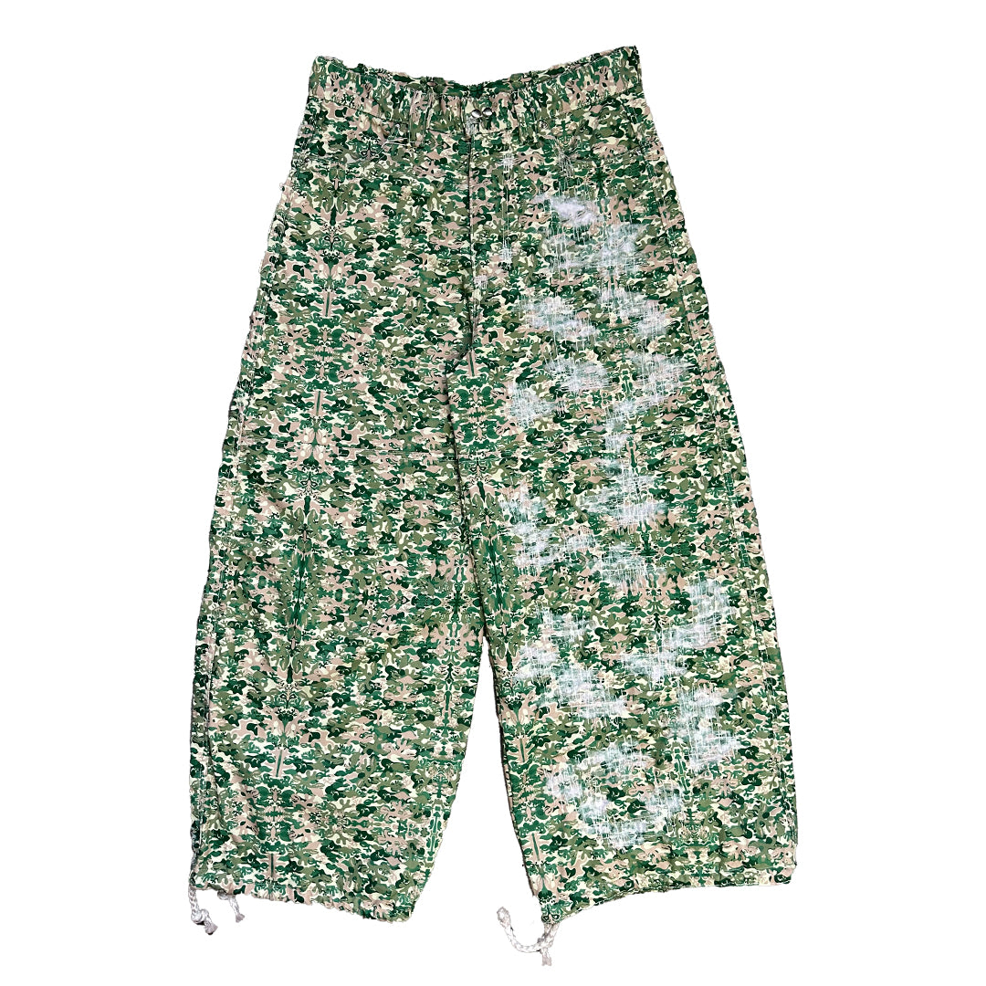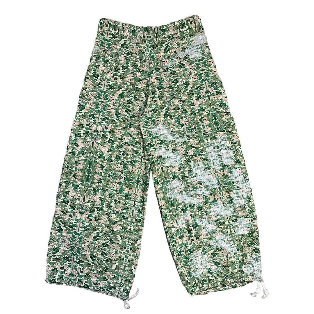 Pantalon entièrement cousu à la main avec détails de textures et déchirures. Lacet pour resserrer le bas du pantalon.